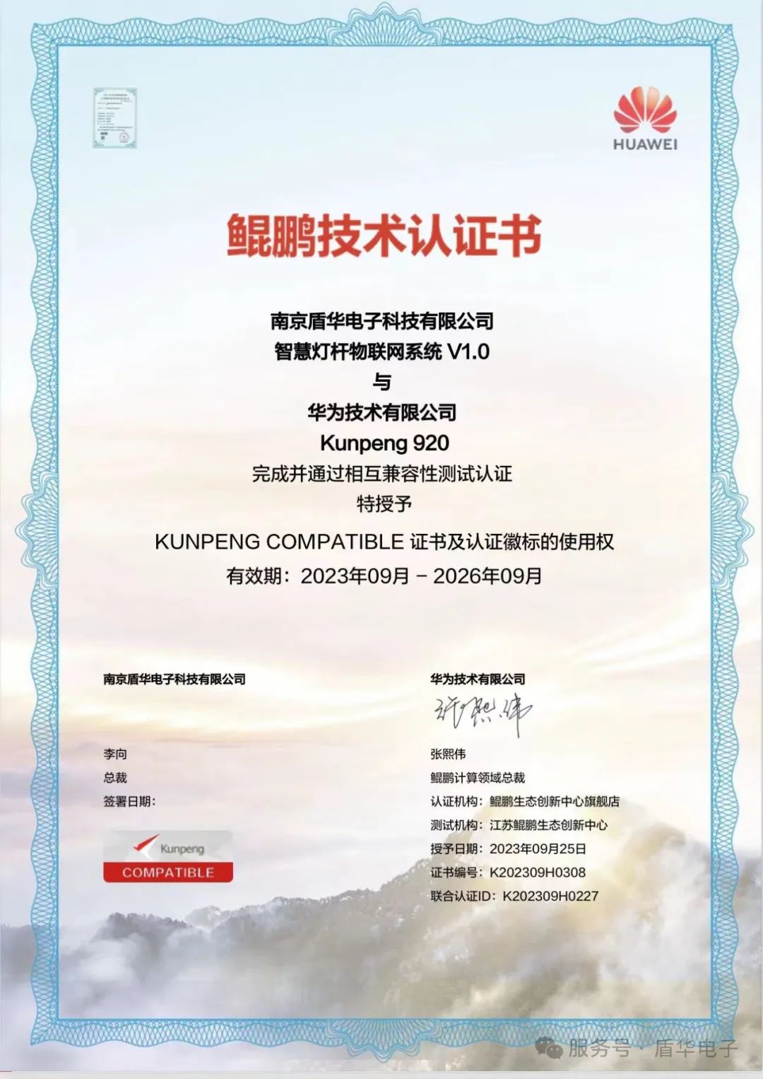 近日南京盾华电子科技有限公司(以下简称“南京盾华”)自主研发的智慧灯杆物联网系统V1.0,与华为技术有限公司Kunpeng 920处理器成功完成兼容性测试认证,正式获得华为鲲鹏技术认证证书(KUNPENG COMPATIBLE)。这一里程碑标志着南京盾华在智慧城市领域的技术实力再获权威认可,同时也为城市新型基础设施建设注入创新动能。